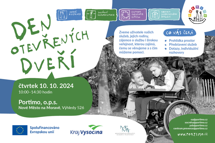 Máme tu pro vás další Den otevřených dveří, tentokrát na naší pobočce Výhledy 526 v Novém Městě na Moravě, kde sídlí služby Osobní asistence, Sociální rehabilitace, Podpora samostatného bydlení a Centrum prevence CéPéčko.